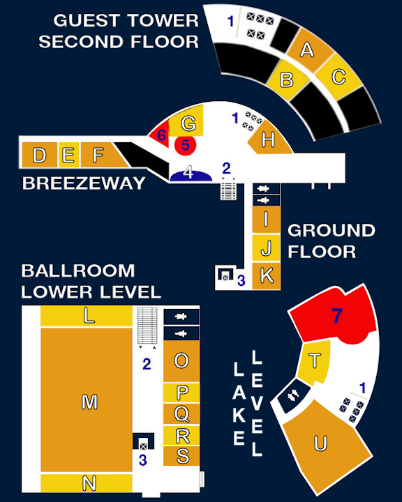 • The Ballroom Level (K-O) is below the Ground Floor (C-J)